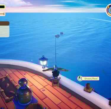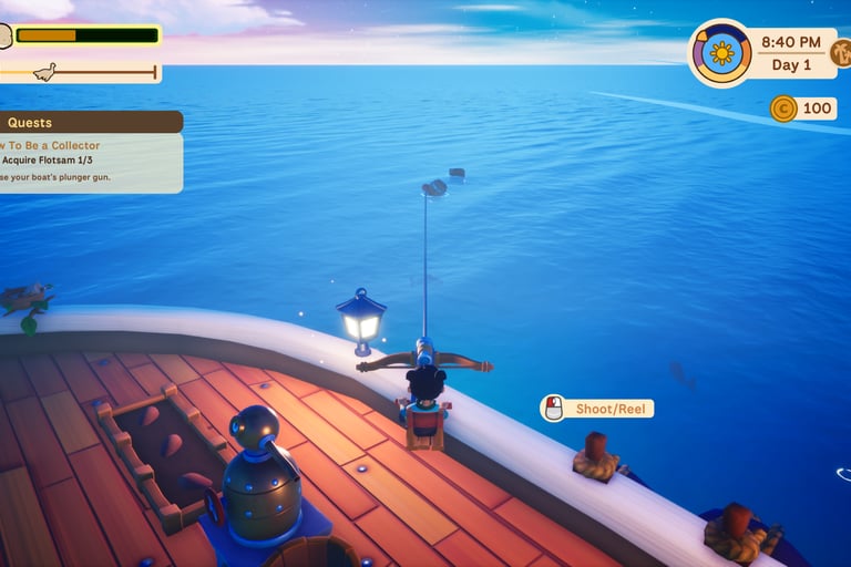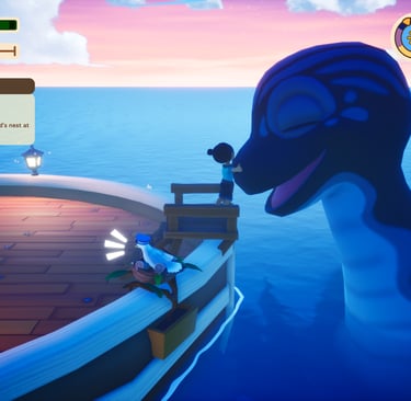 The story is sweet and easy to follow along with. Your parents are collectors out looking for items and now you are old enough to be one, as well. They have prepared you a boat and you have an array of uncles to tell you how to complete tasks. There is a day and night cycle that does impact you and your adorable friend. You must pay attention to the stamina bar because if you run out then your companion will no longer propel your boat forward and sleep instead. This is clearly a great hinderance to growing your collection. Some spots take much longer to travel to, so I would sleep or spend time fishing. Feeding the fish to your teammate will improve their stamina and you can continue on your journey without losing speed.