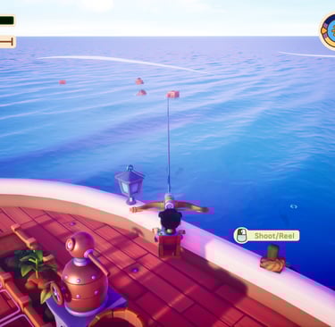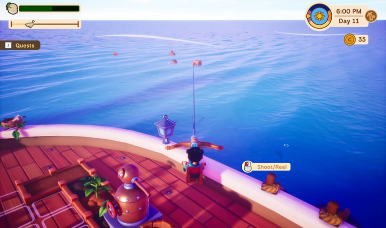 From the moment I set sail there was a peaceful tone set. The art is bright and charming, with islands full of color and soothing ocean environments that encourage exploration rather than urgency. There are no pressures like enemies or strict time limits, although there is a day and night cycle. You can still do things at your pace. The game play is slower and feels more thoughtful when I want to unwind. Activities that might get your adrenaline going include fishing and my favorite, the plunger gun. It felt like a really fun way to allow you to scavenge while still on your boat.