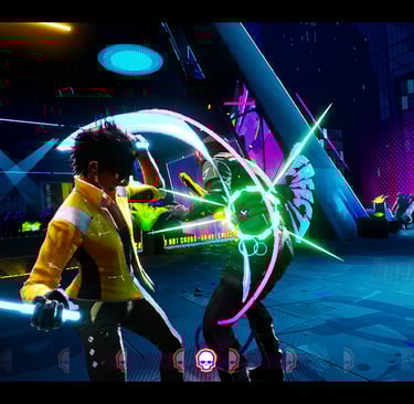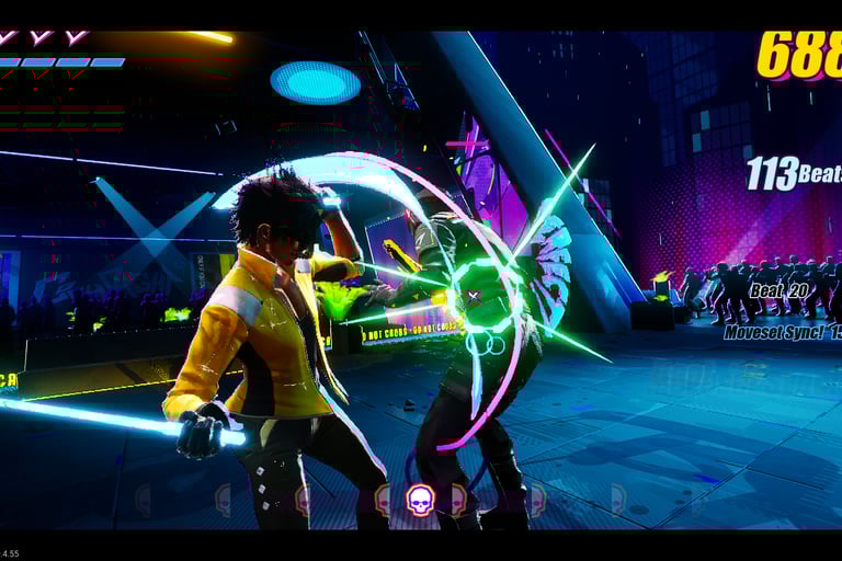 Oh, you want to hear about the combat? Alright, alright, I got you. The combat is as simple or as complex as you want it to be (and I'll admit, for any true fighting game enthusiast, it's probably on the simpler side, but I digress). Each fight is a series of attacks, counters, takedowns, dodges, and finishers, all set to the heart pounding beats of the soundtrack. The combat is relatively free form, but most actions beyond the base attack require certain conditions to be met first. For a non fighting game, this works beautifully, as there are no specific button combinations to memorize for certain combos. Knowing that my takedown "skull" meter is full and my "fever rush" bar is maxed is all I need to decide it's time to go to town. Target priority is up to you, though the game does nudge you in certain directions and combo strings tend to come together naturally. If you want complete autonomy over every punch speed and the freedom to decide between a leg sweep or a jumping knee, this might not be the combat system you're looking for. But for what I want, fighting and rhythm melding together in beautiful, neon blooded chaos, it's ideal.