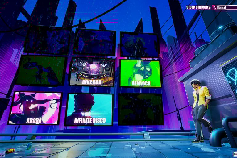 Now that I've explained how I got here, let me tell you why I plan to stay (and why I've already blocked out my calendar for the week of this game's release). Let me start with the game's main protagonist, Charlie Disco. Many have probably seen clips of Cowboy Bebop and Spike Spiegel "dancing" around enemies mid fight to the downbeats of Japanese jazz. Charlie embodies that same sense of fluid, eloquent combat but instead of jazz, you can "dance" and smack NPC faces in to whatever songs you want, since the game lets you upload any tracks from your local library. I've found that my preference leans toward the game's original soundtrack, because it syncs up better with the combat (and given the "why" I'm here, that sync is a must), but regardless, this feature also satisfies another itch: seeing the music videos stuck in my head come to life.