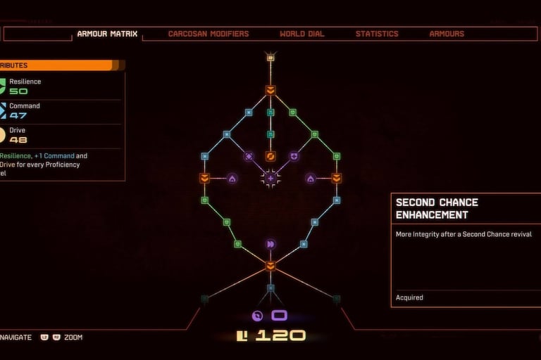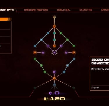 Saros is a roguelite. Your progress doesn’t end at death like Returnal. Where Returnal had some light metroidvania elements where you could keep key items for each run, Saros takes it a step further. You’re introduced to these elements after your first run, a large sprawling skill tree you can use to upgrade yourself in various ways. From improved maximum health, more currency on each run or even one guaranteed revival when you die in a run. This system makes you more powerful after every attempt.